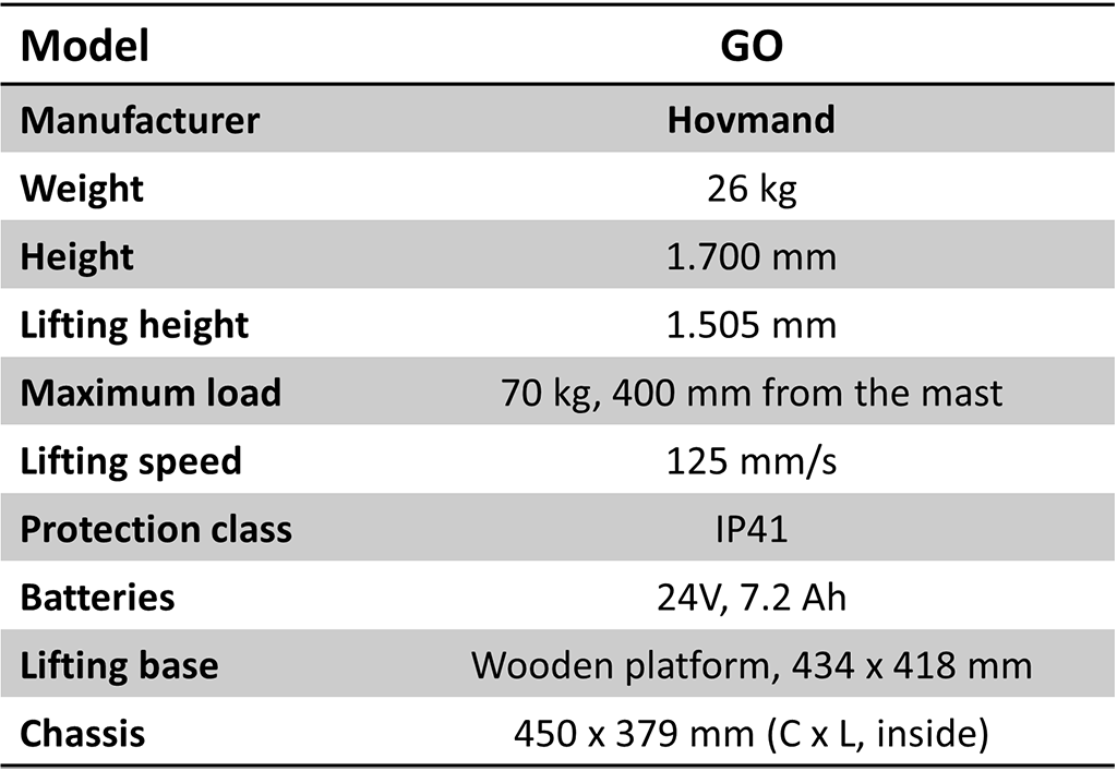 Thanks to the supplied charging unit, the electric lifting trolley GO can easily be recharged for continuous use at a standard electrical socket. In addition, it is delivered at an unbeatable price in a box for self-assembly – all in the quality for which Hovmand is so well known.